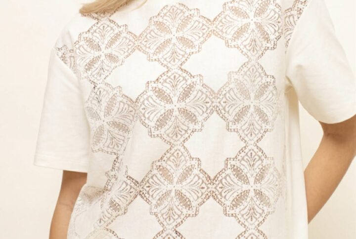 • Spodnie: Niezwykle efektowne spodnie typu wide leg wykonane z misternej, wysokogatunkowej koronki o kwiatowym motywie. Szerokie nogawki zapewniają swobodę ruchów i nadają stylizacji lekkości oraz luksusowego charakteru.